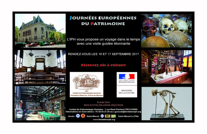 COMPLET ! JOURNEES EUROPEENNES DU PATRIMOINE 2017 Sur les traces de notre passé Actualité Publié le mardi 12 septembre 2017 à 10h33min Venez découvrir exceptionnellement les salles mythiques de l’IPH telles que la salle de Paléontologie Humaine , la salle de Préhistoire, la bibliothèque, l’amphithéâtre, mais aussi l’architecture unique du bâtiment. Flyer JEP PDF