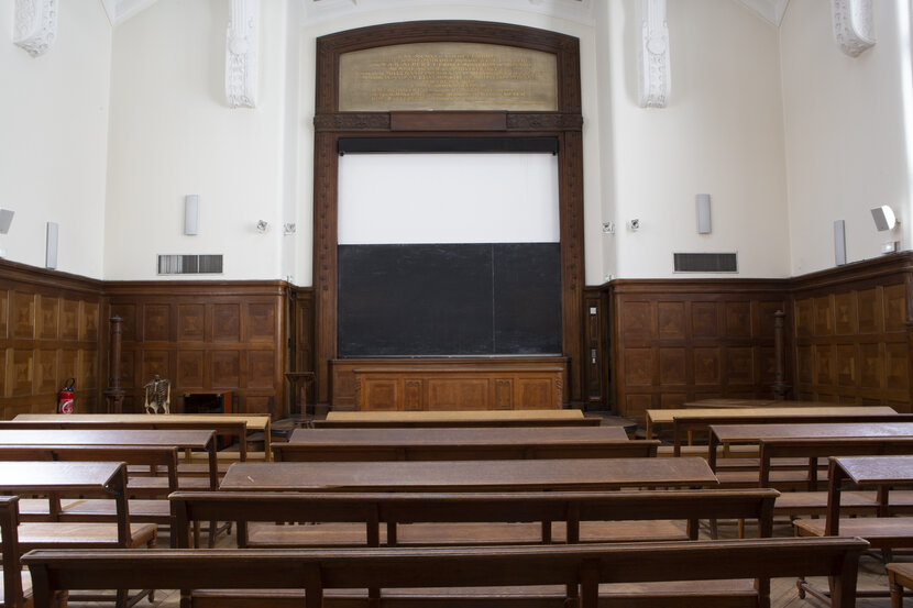 Conservé tel qu’à son origine, l’amphithéâtre est desservi par un hall spacieux et des couloirs pouvant accueillir un cocktail.