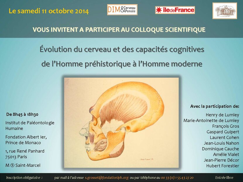 L’Institut de Paléontologie Humaine en collaboration avec la Région Ile-de-France dans le cadre des manifestations scientifiques DIM Cerveau et Pensée vous attendent nombreux le samedi 11 octobre pour une journée de séminaire consacrée à l’Évolution du cerveau et des capacités cognitives de l’Homme préhistorique à l’Homme moderne.